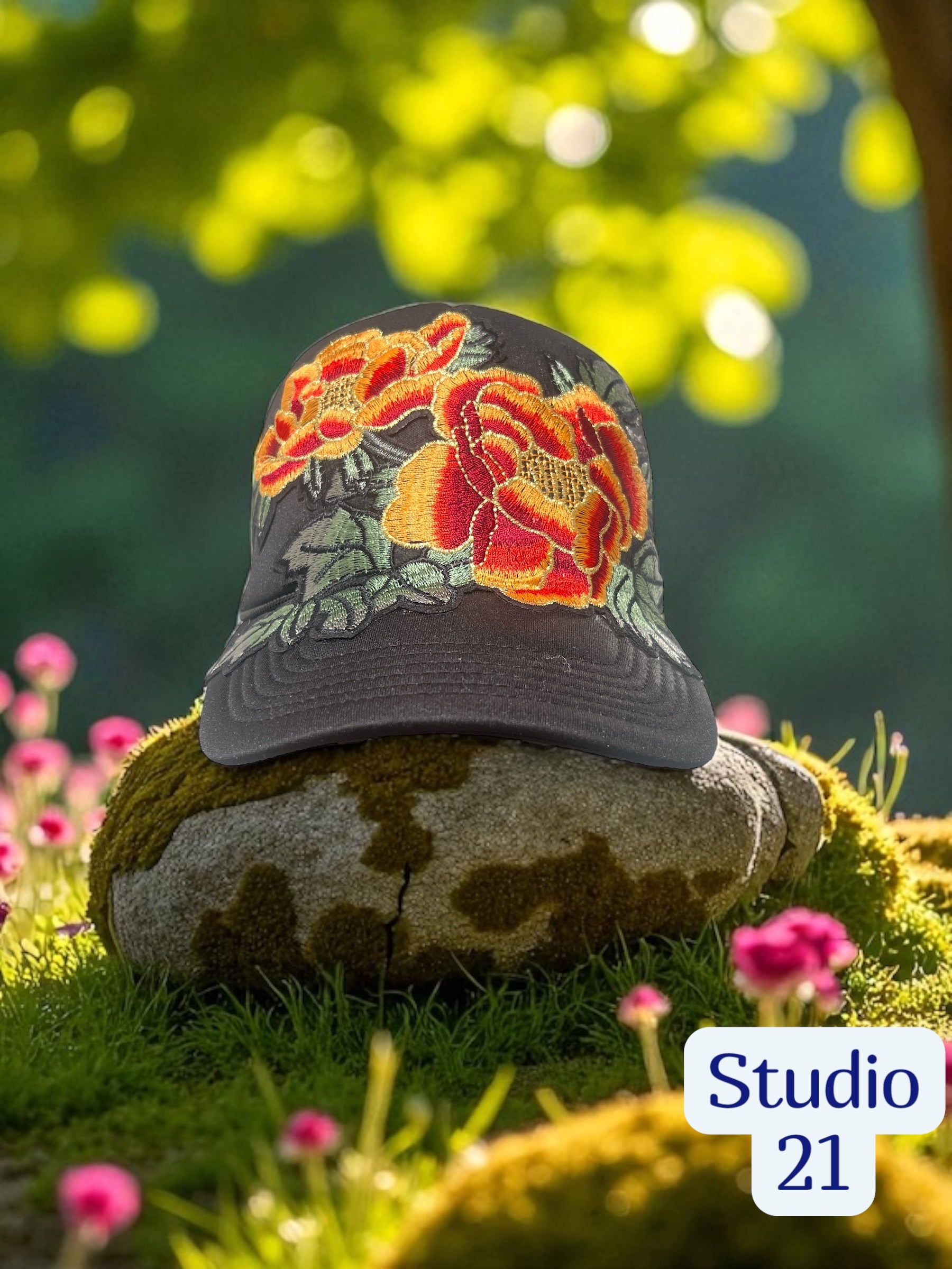Bring effortless edge and vibrant beauty to your look with this black mesh trucker hat, featuring a bold floral design in rich shades of melon and burgundy. The striking embroidered blooms add dimension and drama against the deep black backdrop, creating a one-of-a-kind statement piece that’s both feminine and fierce.