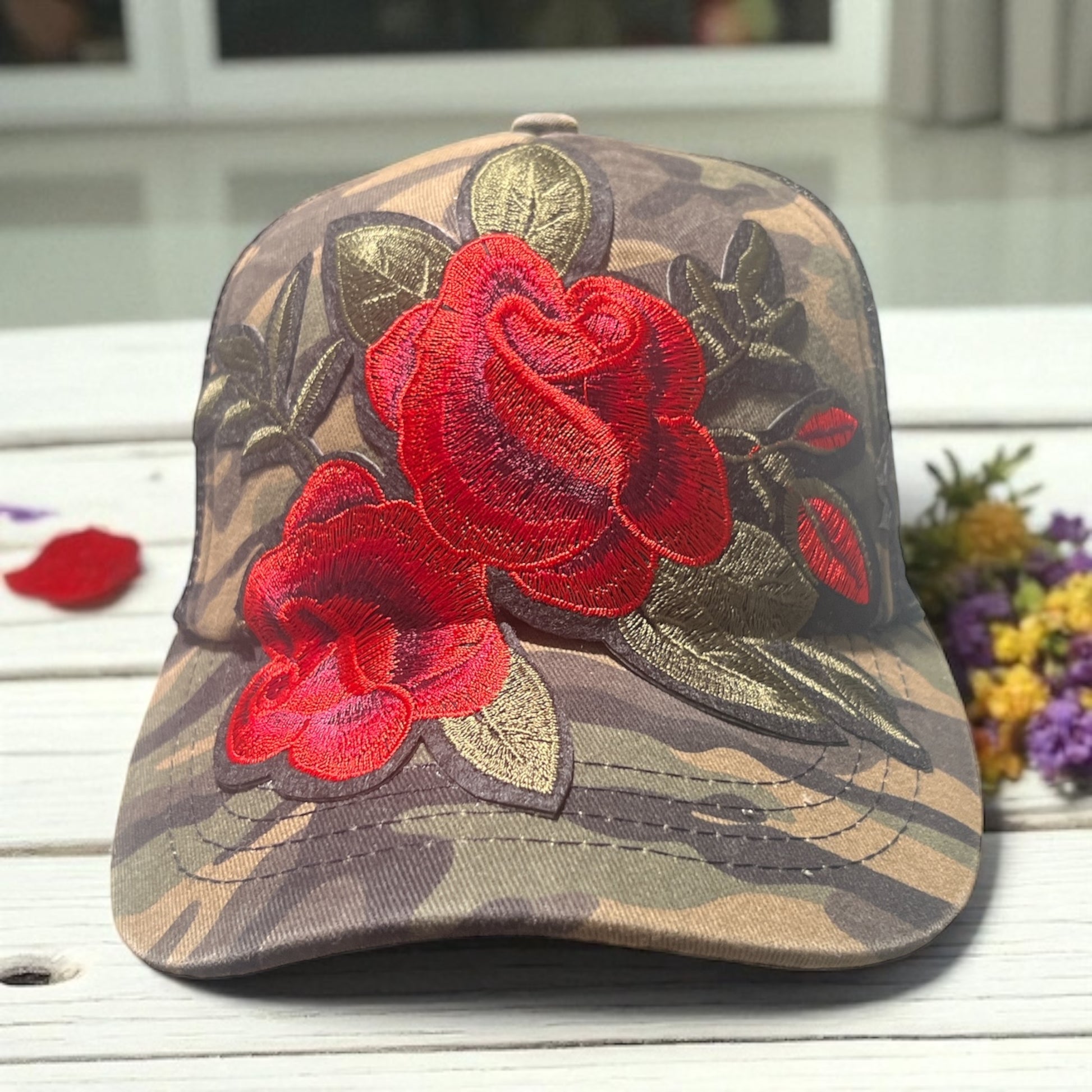 Add fierce flair to your fit with this camo trucker hat, featuring a bold red floral embroidered embellishment that turns heads. The structured white front panel highlights the vivid floral design, while the black mesh snapback keeps it cool, breathable, and adjustable for all-day comfort. It’s the perfect blend of rugged and feminine—whether you're headed to a country concert, a weekend market, or just out to show your edge with style.