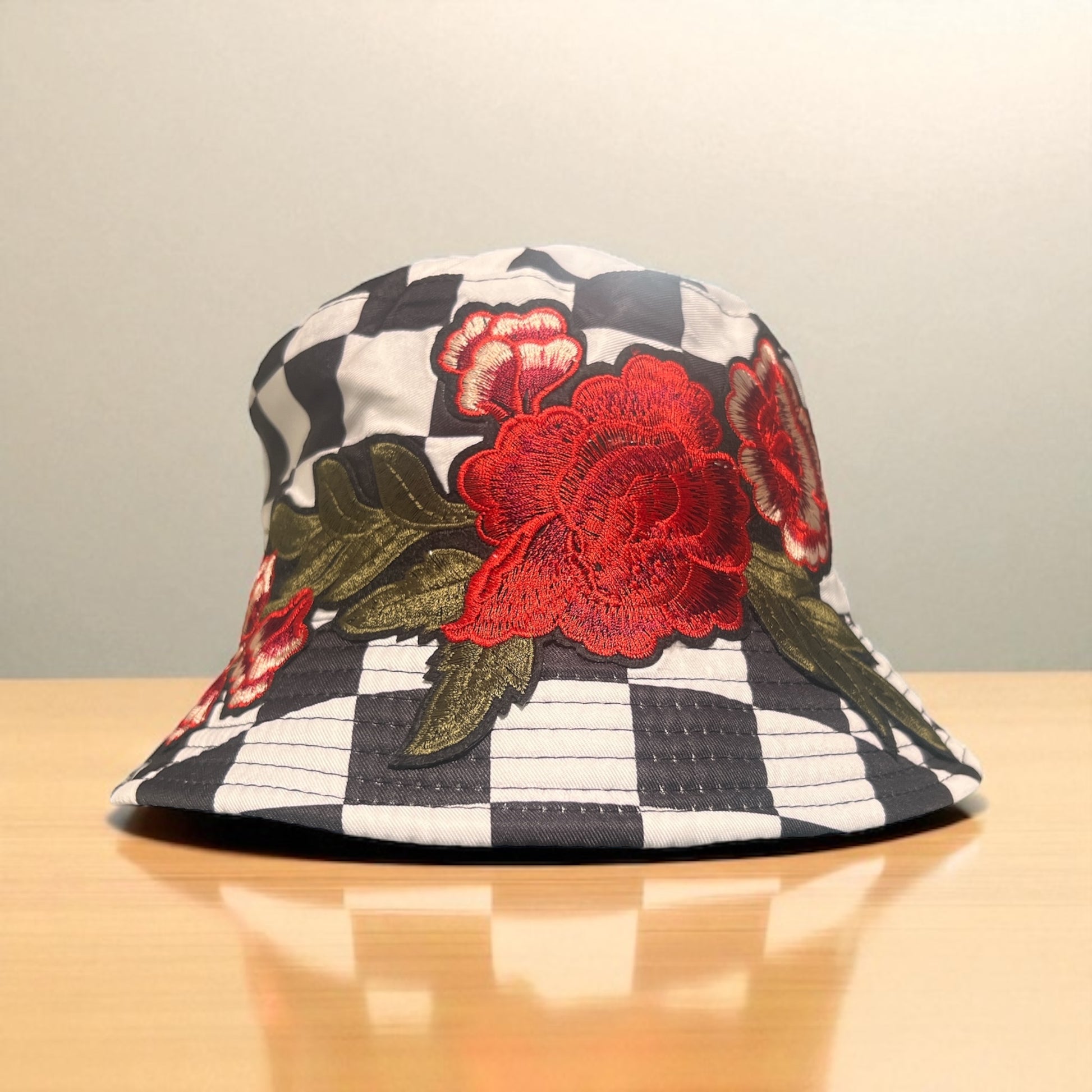 Turn heads and mix patterns like a pro with this bold Checkered Bloom Bucket Hat. Featuring a classic black and white checkerboard print, this bucket hat brings serious statement energy — softened with stunning embroidered red floral designs for a punch of color and elegance.