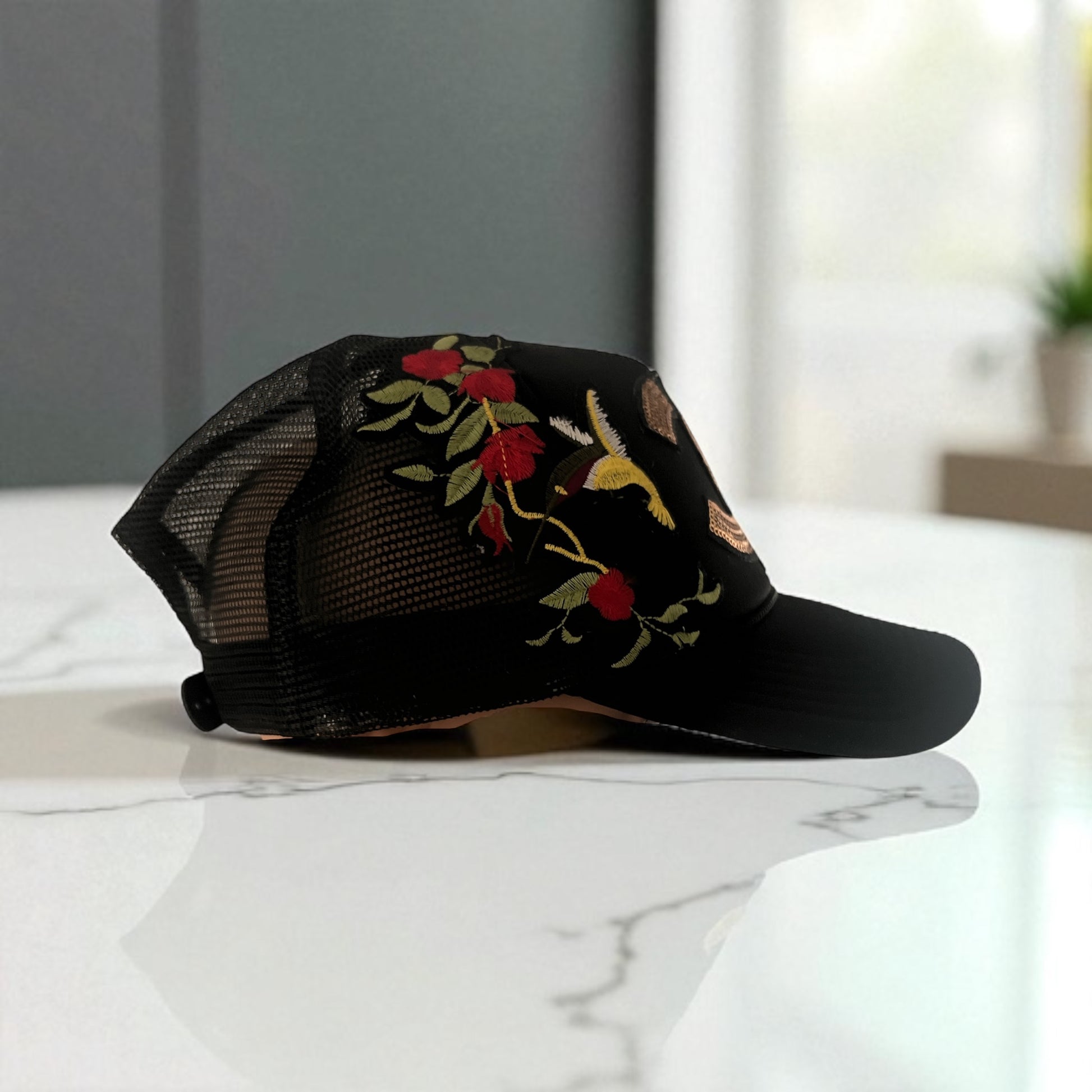 Luxury Bloom Trucker Hat – Black Snapback with Gold Sequin CC designer inspired Red Rose Embroidery & Hummingbird
